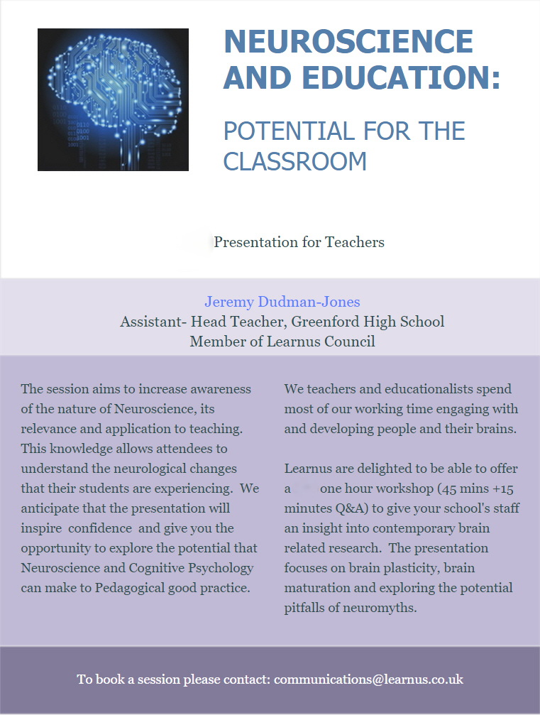 We offer a one hour workshop for teachers (45 mins & 15 mins Q&A) to give your staff an insight into contemporary brain related research; focussing on brain plasticity, brain maturation and exploring the potential pitfalls of neuromyths.